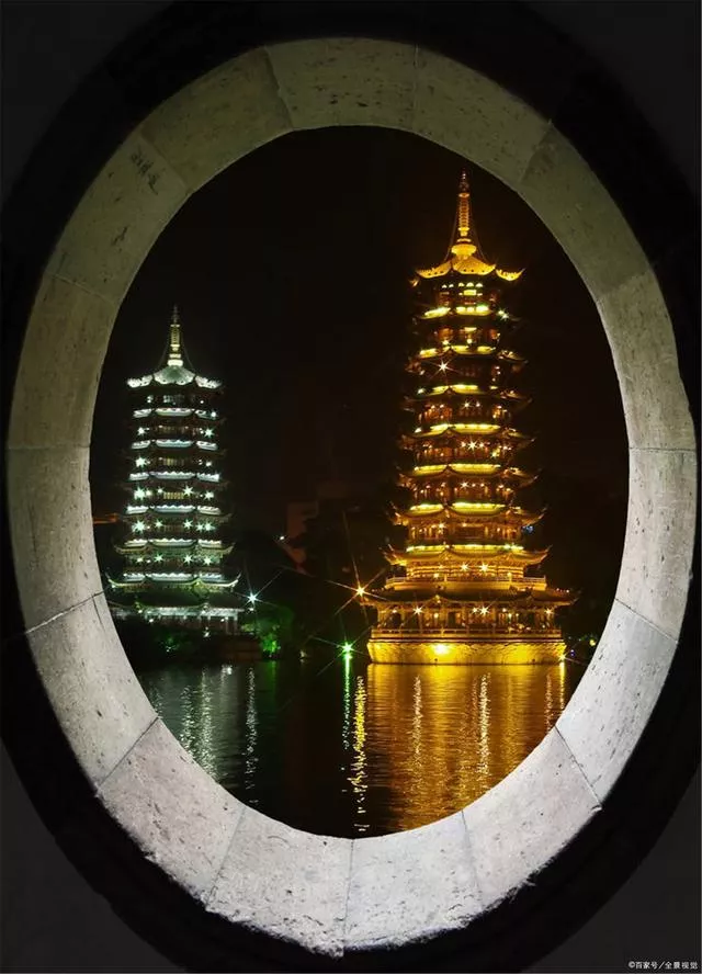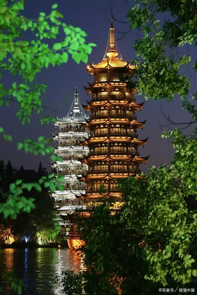 日月雙塔,曾焚毀于古代戰(zhàn)火中,后建成于2002年,在唐代佛塔基礎和殘骸于2001年重建,地處桂林市中心區(qū),坐落在桂林城的中軸線、桂林杉湖島上, 與"象山水月"相鄰。象山是桂林的城徽,而雙塔則是新桂林的標志。日塔、月塔與象山上的普賢塔、塔山上的壽佛塔,相互呼應,相互映襯,有"四塔同美"之說。日月雙塔號稱世界第一銅塔,是桂林旅游的一個夜景觀賞地。其中日塔高41米共九層,通體均為純銅裝飾,耗用銅材350噸,并有電梯供游客觀光乘坐。銅塔所有構(gòu)件如塔什、瓦面、翹角 、斗拱、雀替、門窗、柱梁、天面、地面完全由銅壁畫裝飾,整座銅塔創(chuàng)下了三項世界之最-世界上最高的銅塔,世界上最高的銅質(zhì)建筑物,世界上最高的水中塔。月塔高35米共七層,為琉璃塔。每層的雕花彩繪門窗寓意不同的主題,富含中國傳統(tǒng)韻味,通過水下18米長的水族館與日塔連接,其地宮之中有桂林明代青花梅瓶大型壁畫。——摘自百度