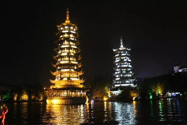 日月雙塔,曾焚毀于古代戰(zhàn)火中,后建成于2002年,在唐代佛塔基礎(chǔ)和殘骸于2001年重建,地處桂林市中心區(qū),坐落在桂林城的中軸線、桂林杉湖島上, 與"象山水月"相鄰。象山是桂林的城徽,而雙塔則是新桂林的標(biāo)志。日塔、月塔與象山上的普賢塔、塔山上的壽佛塔,相互呼應(yīng),相互映襯,有"四塔同美"之說。日月雙塔號稱世界第一銅塔,是桂林旅游的一個夜景觀賞地。其中日塔高41米共九層,通體均為純銅裝飾,耗用銅材350噸,并有電梯供游客觀光乘坐。銅塔所有構(gòu)件如塔什、瓦面、翹角