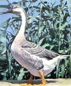 品種特征:公鵝肉瘤較大,呈棱脊形,胸部寬深。母鵝肉瘤小而扁平。羽毛多為灰褐色,純白色占5%左右。灰褐色的成年鵝,從頭部至頸部的背面,有一條深褐色的羽帶。頸部?jī)?nèi)側(cè)至胸、腹部呈灰白色或白色.肉瘤呈黑色或黃色帶黑斑,脛、蹼呈橘黃色。成年公鵝體重4.5千克左右,母鵝 4.0千克左右。