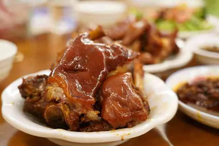 青巖狀元蹄,又稱青巖鹵豬蹄,是貴州省貴陽(yáng)市花溪區(qū)青巖鎮(zhèn)地方傳統(tǒng)名菜,屬于黔菜系。青巖狀元蹄以豬蹄、冰糖、植物油、醬油、精鹽、料酒、味精、生姜、大蔥、八角、山奈、小茴香、甘草等為原料精心鹵制而成。食用時(shí),蘸上用胡辣椒面、雙花醋、精鹽、味精、醬油、姜末、蔥花等制成的辣椒水,吃起來(lái)肥而不膩,糯香滋潤(rùn)。鹵豬腳成為古鎮(zhèn)滿街飄香的美食,現(xiàn)在在貴州各地,都能發(fā)現(xiàn)青巖鹵豬腳的身影?!驹敿?xì)】