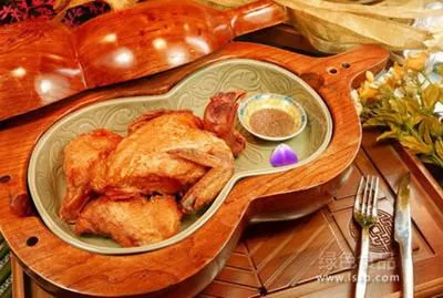 葫蘆雞是陜西西安市漢族傳統(tǒng)名菜,始于唐代,被稱為“長(zhǎng)安第一味”,其特點(diǎn)是色澤金紅,皮酥肉嫩,香爛味醇。葫蘆雞的制作分清煮、蒸籠、油炸三道工序,制作時(shí)先放在清水中漂洗,除凈血污,煮時(shí)用麻絲將雞捆好,以保持雞的整形,待鍋內(nèi)涼水燒沸,放入雞,煮半小時(shí)取出,盛盆內(nèi),添肉湯、料酒、精鹽、醬油、蔥、姜、八角、桂皮,入籠蒸透。油炸時(shí),將菜籽油燒八成熱放入蒸好的整雞,用手勺撥動(dòng),至雞是金黃色時(shí),用漏勺撈出,瀝油,隨即盛盤中,上桌時(shí)另帶小蝶花椒鹽佐食。葫蘆雞被中國(guó)烹飪協(xié)會(huì)、陜西省商務(wù)廳評(píng)選為“陜西十大名菜”,還被中國(guó)烹飪協(xié)