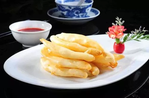 脆皮銀魚是江蘇無錫的一道名菜,外脆里嫩,鮮香可口。銀魚產(chǎn)于中國東南沿海的淡水湖泊,通體潔白如玉,肉質(zhì)細嫩少刺,是一種稀有名貴淡水魚,其質(zhì)量以太湖所產(chǎn)為最佳。據(jù)史料記載,銀魚在我國唐宋時期即已為食用。脆皮銀魚系選用優(yōu)質(zhì)太湖銀魚經(jīng)碼味、掛糊炸制而成,食時蘸以調(diào)料,成品后銀魚體態(tài)飽滿,色澤奶黃,外脆里嫩,鮮美適口,營養(yǎng)豐富。