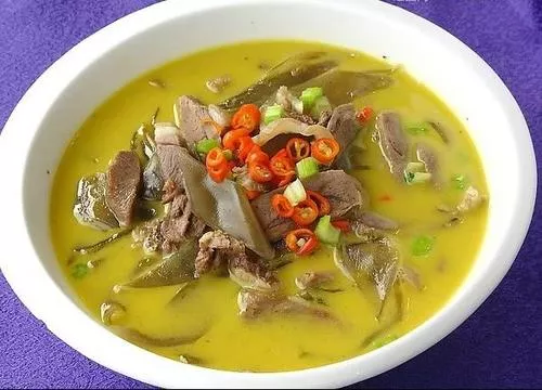 渣江假羊肉是湖南衡陽縣渣江鎮(zhèn)地方風(fēng)味小吃,也是衡陽經(jīng)典的小吃。渣江假羊肉歷史悠久,傳說宋徽宗皇帝被金兵擄去,皇后至此避難,由于身受風(fēng)寒,周身不適,食欲不振,當(dāng)?shù)孛麖N做假羊肉湯獻(xiàn)上,皇后食后渾身大汗,頓覺輕松舒適,從此渣江假羊肉湯名聲大噪。假羊肉湯并不是用羊肉做成的,是以豬頭肉、豬瘦肉,佐以八角、桂皮、花椒一同熬成肉湯待用,再將荷折片切成細(xì)長條,倒入肉湯中,煮沸10分鐘,加入蒜苗、蔥段和黃花菜,起鍋淋入香油,撒上辣椒粉和胡椒粉即成。