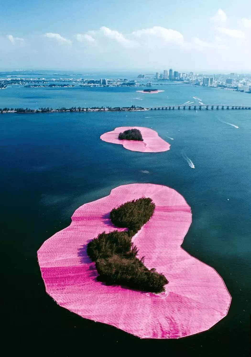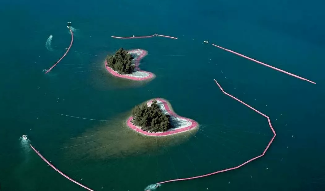 這件作品叫《被環(huán)繞的島嶼》,是位于邁阿密的一個(gè)海島,克里斯托和讓娜·克勞德夫婦把島的外圍邊緣用粉色尼龍布進(jìn)行包裹,從空中俯瞰就像一朵在海面上盛開的巨大的粉色花朵,島上的綠色就是花芯。