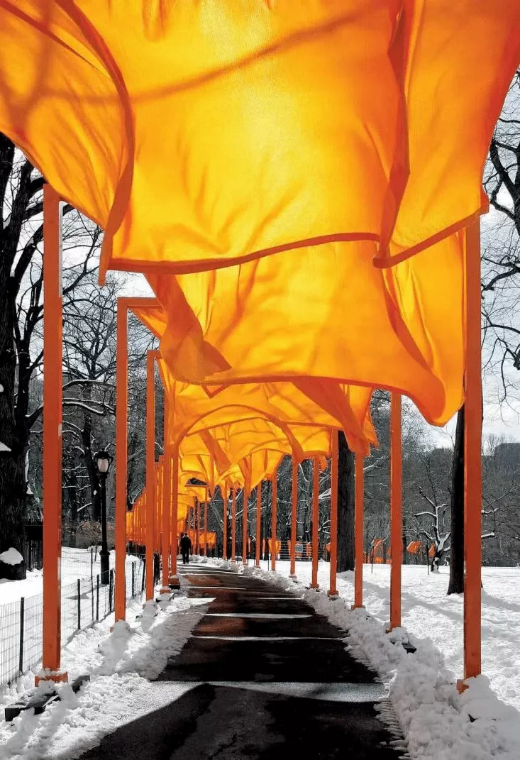 這是克里斯托和讓娜·克勞德夫婦的作品《峽谷垂簾》,是用橙黃色的尼龍布垂掛在美國(guó)科羅拉多兩個(gè)峽谷之間。這是當(dāng)時(shí)包裹巴黎塞納河上著名的新橋。這件作品《門》是在紐約中央公園,讓我們聯(lián)想到日本的一種獨(dú)特寺廟景觀,叫作“鳥居”,是日本寺廟入口的牌坊,兩端微微翹起,很漂亮的一種建筑。踏入鳥居就意味著進(jìn)入神域。這可能也是藝術(shù)家創(chuàng)作這件作品的靈感來源。