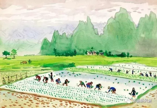 周令釗《插秧》水彩