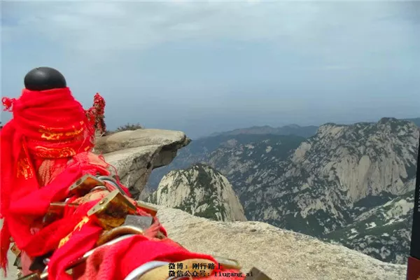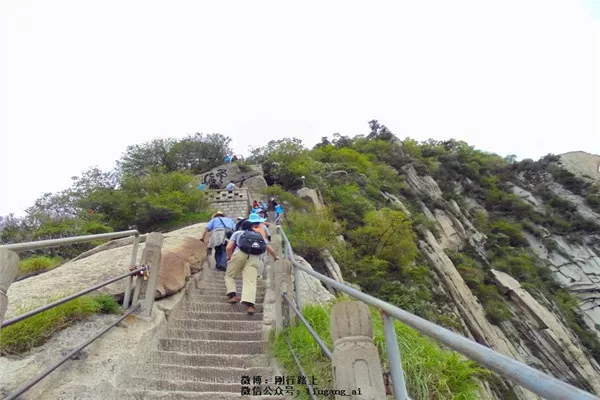 我的行程是從華山的北峰,徒步經(jīng)擦耳崖、上天梯、蒼龍嶺等,經(jīng)五云峰抵金鎖關(guān)游覽天外諸峰即東峰、西峰、南峰及中峰等,沿原路返回北峰后可乘索道下山。