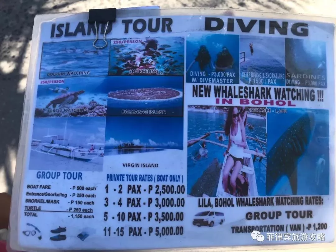 第二天將行程定在邦勞島上,如果想出海潛水的話,需要在大早上6點(diǎn)左右趕到阿羅那海灘,海灘周邊會有很多提供出海游的小旅行社,會給你推薦他們的出海套餐,套餐種類繁多,可以去巴里卡薩島潛水,也可以追海豚、看海龜。