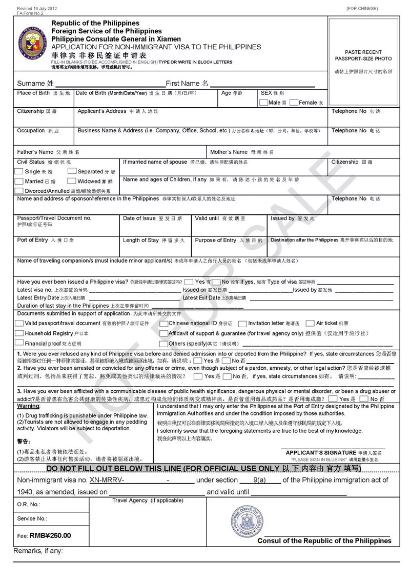 要準(zhǔn)備的材料:1、準(zhǔn)備好有效美簽(或上面列的幾種簽證)及護(hù)照首頁的復(fù)印件(兩者復(fù)印在同一張紙上,必須同一面),若是換了護(hù)照,則新舊護(hù)照一起帶上就可以了。2、準(zhǔn)備好7天內(nèi)離境的機(jī)票行程單、菲國酒店預(yù)訂單