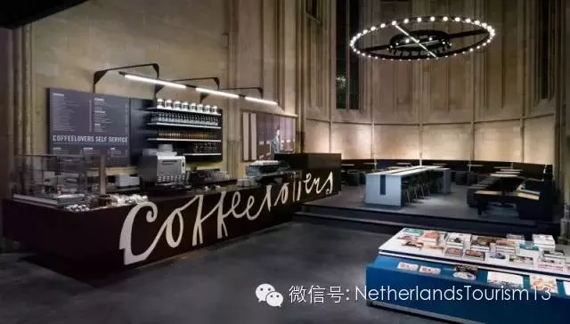 登上三層黑色書架頂層,可近距離欣賞教堂穹頂上14世紀(jì)的壁畫,亦或俯視整個教堂。溫馨的咖啡角由原來的唱詩班區(qū)所改,餐桌為一個放平的十字架,深邃的空隙間放有各種報刊。