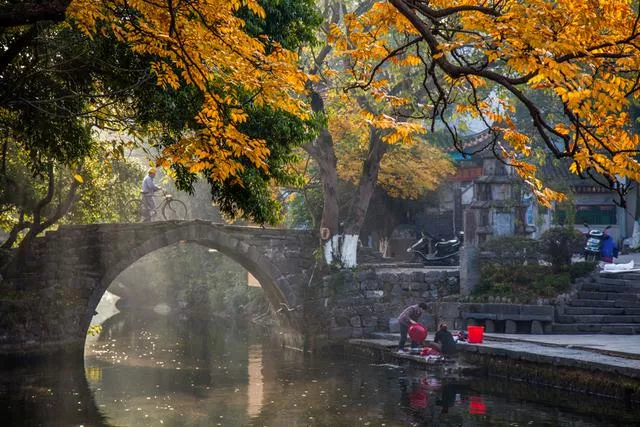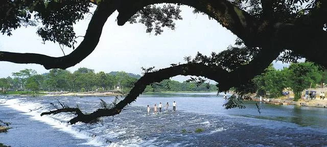 船工吱吱呀呀地用篙撐著船向前走,每經(jīng)過一個地方,導(dǎo)游對這里曾經(jīng)發(fā)生的故事娓娓道來——看到那座水上石橋了嗎?那可是已經(jīng)有將近兩千年的歷史了。漢代伏波將軍馬援當(dāng)年征戰(zhàn)至此,要過這里原來的老橋,無奈坐騎揚(yáng)啼嘶喊,不肯過橋。將軍下馬一看,發(fā)現(xiàn)原來橋已經(jīng)崩塌,于是將自己的愛馬送到集市賣掉,建起了這座橋……