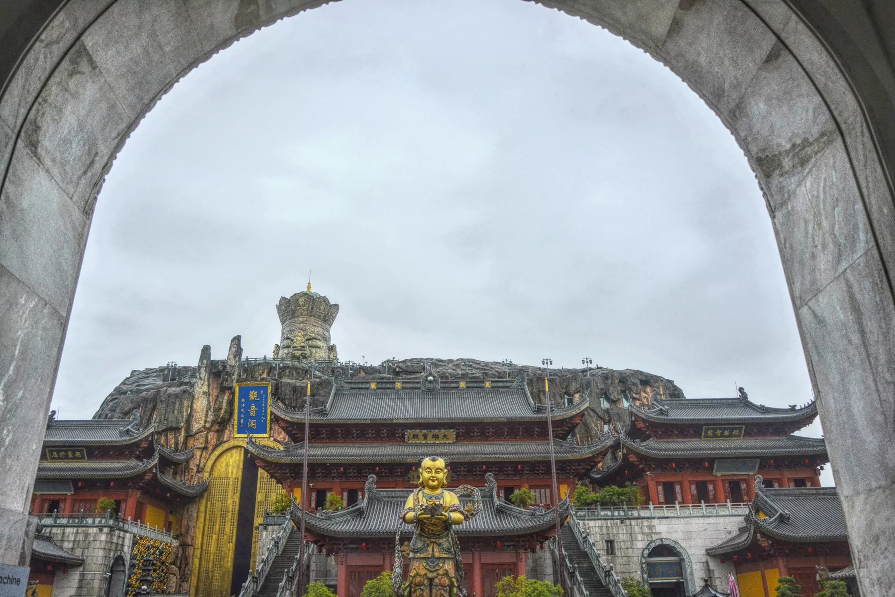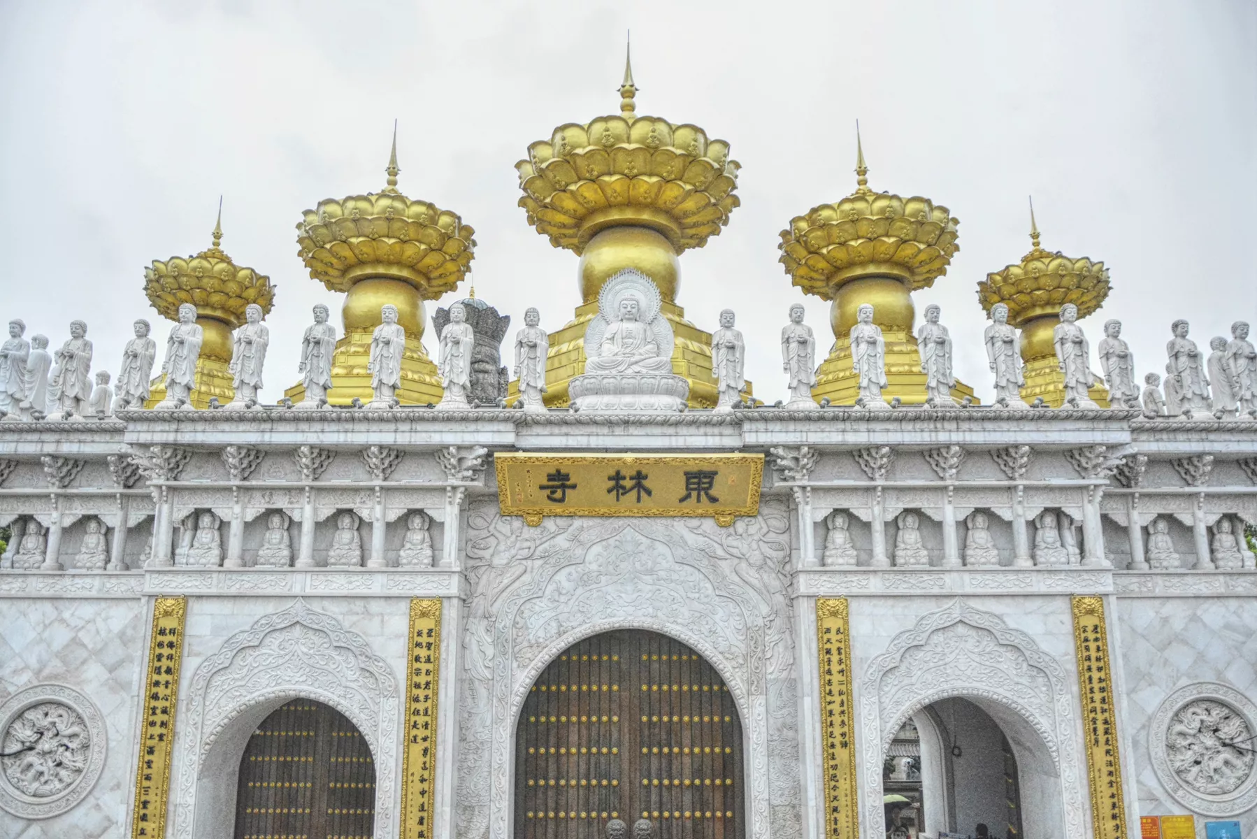 三門-是用60多噸山東名貴漢白玉建造而成 三門(也稱山門)是用60多噸山東名貴漢白玉建造而成,長20米,高15米。三門上方四周站立著用漢白玉雕刻成莊嚴肅穆的48尊阿彌陀佛像,代表阿彌陀佛的四十八愿,上方的中間巍立著用黃銅手工巧打而成的五朵金蓮花,外用鎏金金工藝,整個三門結合凈土宗的思想,構思獨特,造型精致,是國內(nèi)佛寺中獨一無二、莊嚴無比的三門。