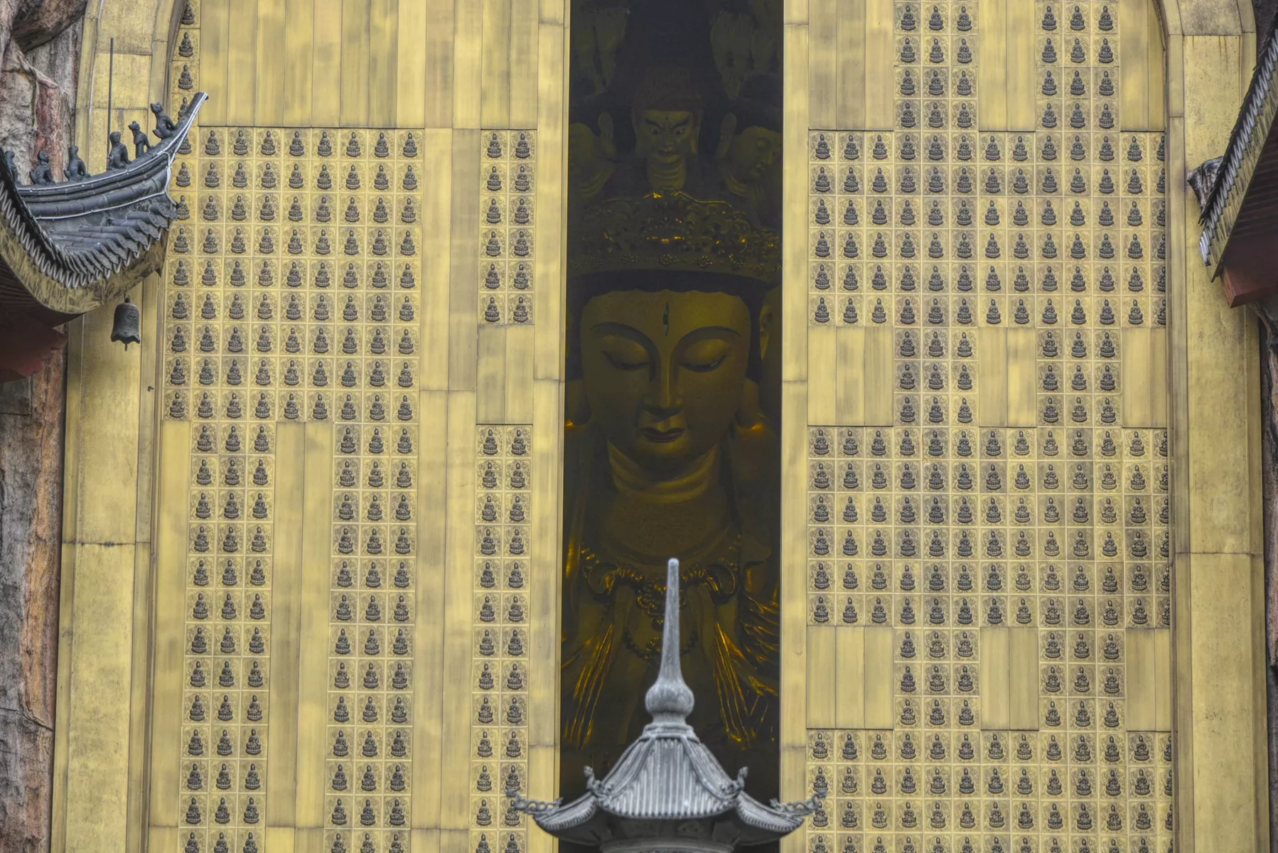 千佛門-用黃銅制作,門上刻有999尊銅觀音像 大世界基尼斯之最----最高的銅門"千佛門 ,用黃銅制作,高20.08米,寬10.295米,門上刻有999尊銅觀音像,組成一個與門等高的大“佛”字,稱為中國佛教第一銅“千佛門”。