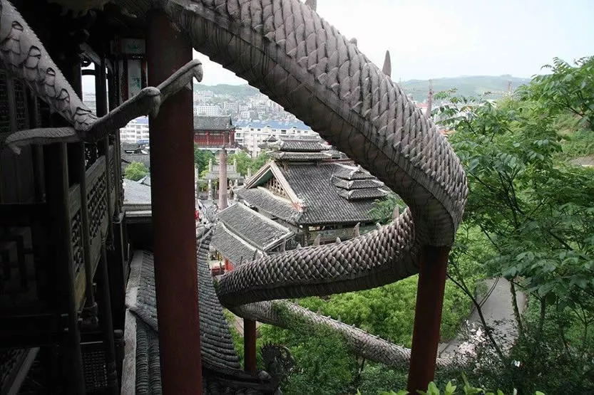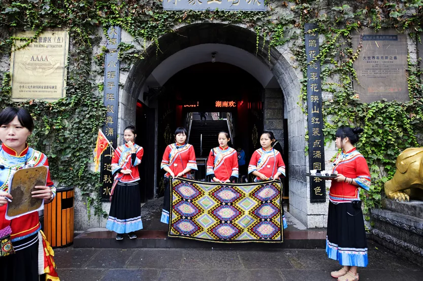 土司城原為永定土司城,是一座古老的土家山寨。土司制度初建于五代十國時(shí)期,到了明朝己非常成熟了,土司王有無上的權(quán)威,在湘西有三大土司王分別是桑植土司向氏、永順土司王彭氏、慈利土司王張氏,其中又以永順溪州土司彭氏實(shí)力最強(qiáng)。其它土司王都為自己修建一座土司城,唯有彭氏分別在永定、永順修建了二座土司城。在永定的土司城內(nèi),彭氏為顯示其地位,修建了湘西最高的一座高達(dá)48米,共12層的吊腳樓,整棟樓竟無一根鐵釘,堪稱土家吊腳樓建筑史上的奇跡,此樓于2002年9月被評為最高吊腳樓,榮獲世界吉尼斯之最,與此同時(shí)土司城內(nèi)舉辦一千人參加表演的毛古斯舞蹈活動(dòng)獲得0成功,同時(shí)獲得世界吉尼斯之最。進(jìn)入土司城,首先看到土司城迎賓儀式,土家漢子迎賓鼓,吹牛角、放沖,土家姑娘攔門歌,敬攔門酒,進(jìn)入城內(nèi),在祭祀堂前舉行百人土家大祭祖活動(dòng),男女老少唱擺手歌、跳擺手舞,登世界最高的吊腳樓九重天,參觀土家族千百年來文化展示。到土家山寨,聽土家歌,賞土家族最有代表風(fēng)俗哭嫁,三棒鼓,花燈等民俗表演。