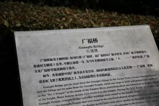 顧村公園建設(shè)時,在原址用漢白玉砌成單孔長橋“青龍橋”。站在橋上,似乎可見當(dāng)年鏖戰(zhàn)的硝煙,厚重的歷史感也許會讓你聽見戰(zhàn)馬的長嘶與鐵蹄的奔騰聲。如今顧村公園中因為施工,青龍橋有一半被欄網(wǎng)攔住。但只走過這半座橋也能隱隱感受到厚重的歷史感。