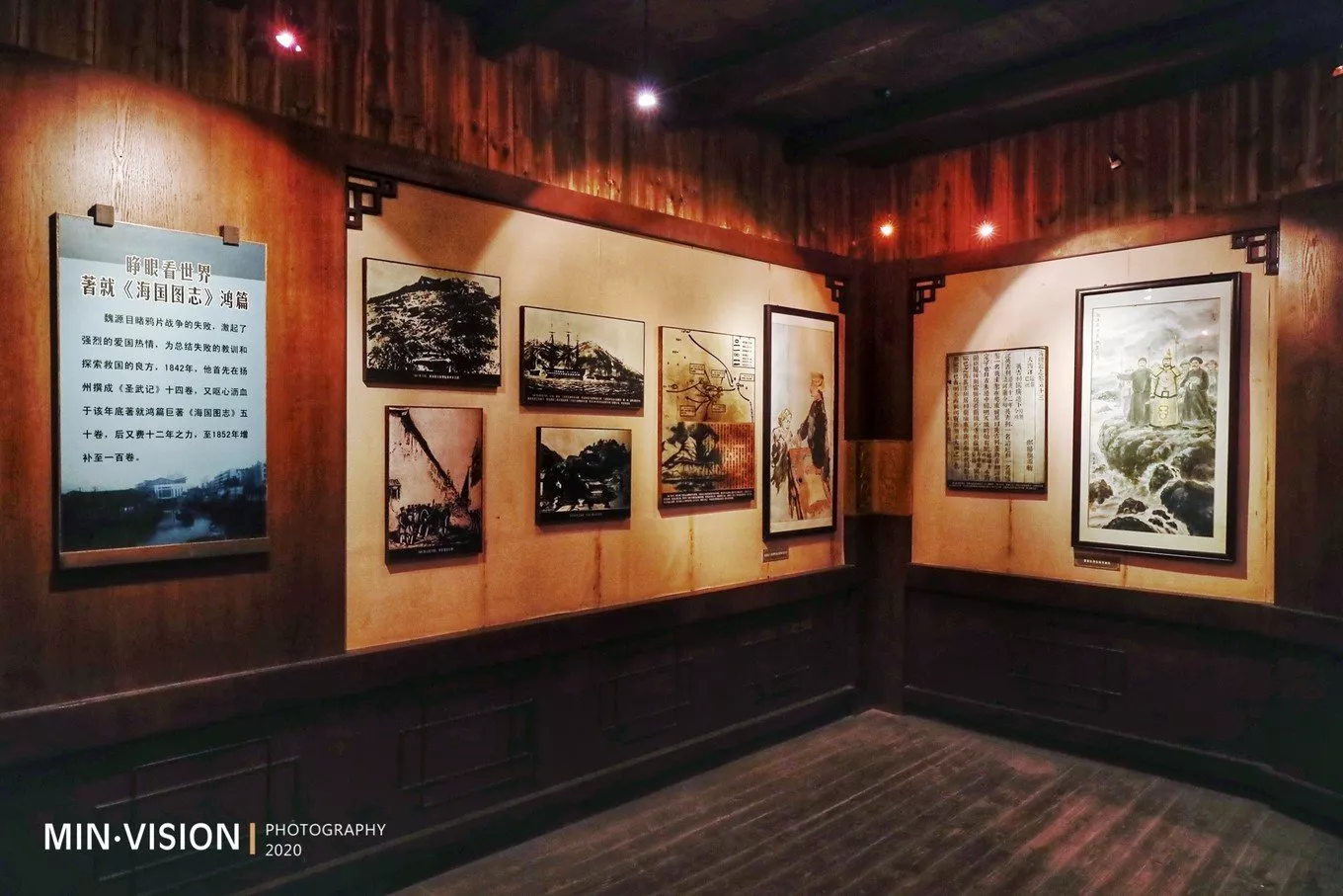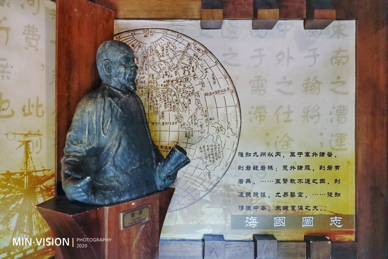 一樓陳列室,宣傳板上圖文并茂的講述著魏源的經(jīng)歷和畢生著作(著有《圣武記》、《古微堂集》、《元史新編》、《老子本義》、《詩(shī)古微》、《春秋繁露注》等書(shū)),有一尊魏源的半身塑像,其身后的墻壁上是一幅世界地圖,取自他的著作《海國(guó)圖志》。
