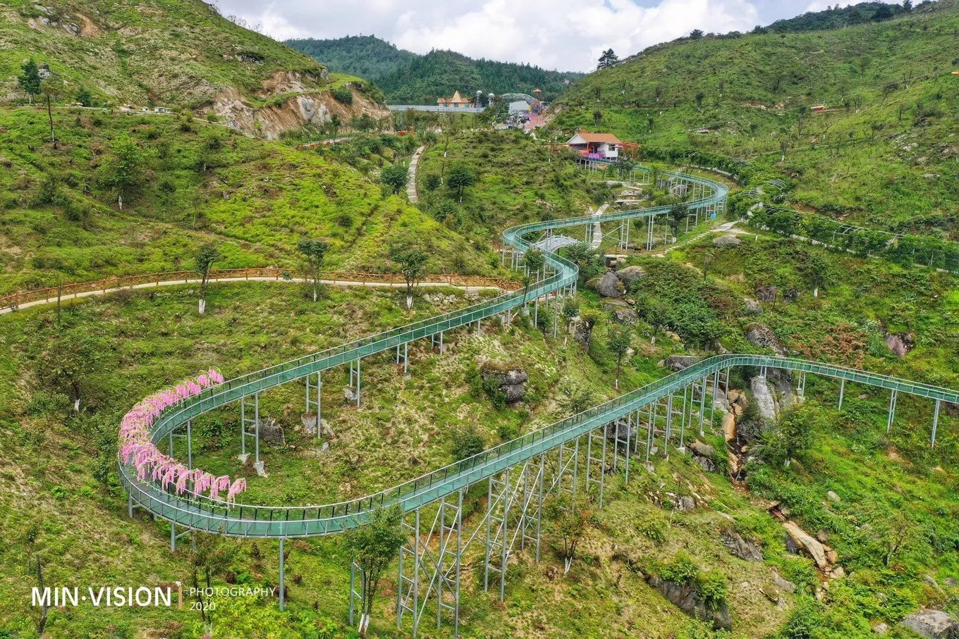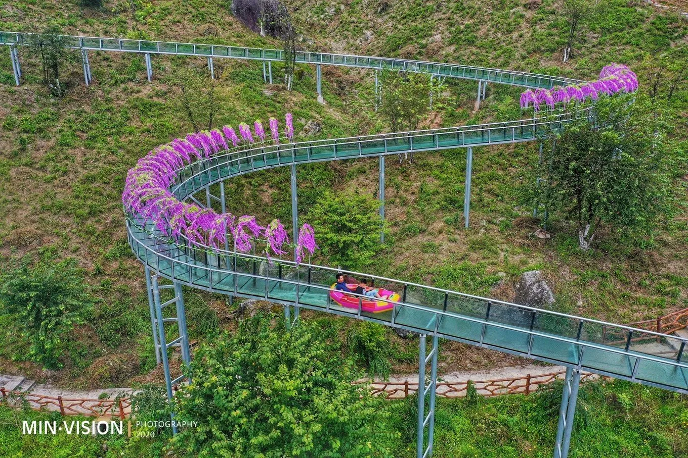走到一半路程,有一處依靠崖壁凸建出來(lái)的玻璃平臺(tái),迎合網(wǎng)紅大咖需求可以有這樣一處造景,也是符合當(dāng)代年輕人口味的,拍攝出來(lái)的照片,人物似在群山云霧中漫步一般……往上行建有一處滑道,可以直接到底看瀑布,但左邊也保留了一條步道,雖然下山會(huì)有些慢,但那些不可錯(cuò)過(guò)的風(fēng)景也都在這條路上。