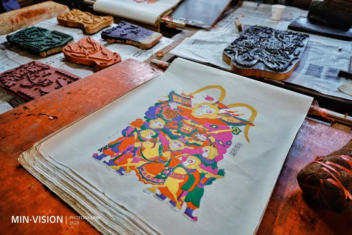 這一次走訪(fǎng)了“灘頭木板年畫(huà)”和“灘頭手工炒紙技藝”。灘頭年畫(huà)是湖南省唯一的手工木版水印年畫(huà),產(chǎn)地在湖南省寶慶(現(xiàn)在為邵陽(yáng))隆回灘頭鎮(zhèn)。隆回灘頭年畫(huà)形成于唐朝李世民時(shí)代,至今已有1300多年歷史?!独鲜笕⒂H》、《秦叔寶.尉遲恭》、《和氣致祥》是灘頭年畫(huà)中的經(jīng)典之作。