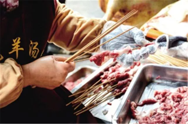 穿過集市,就來到了“羊肉大世界”。羊,赤條條地掛在餐館門口,份量很足的羊肉串小山一樣堆在盤子上。美食街不長,呈橫寫的U形,這頭進(jìn),那頭出,一溜兒不過100多米,大大小小的羊肉館10多家,據(jù)說各家有各家的絕活,或肉好,或湯鮮,或蘸水霸道。
