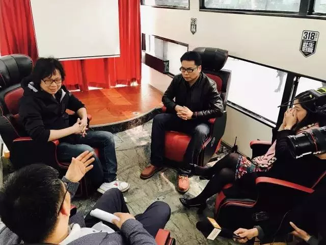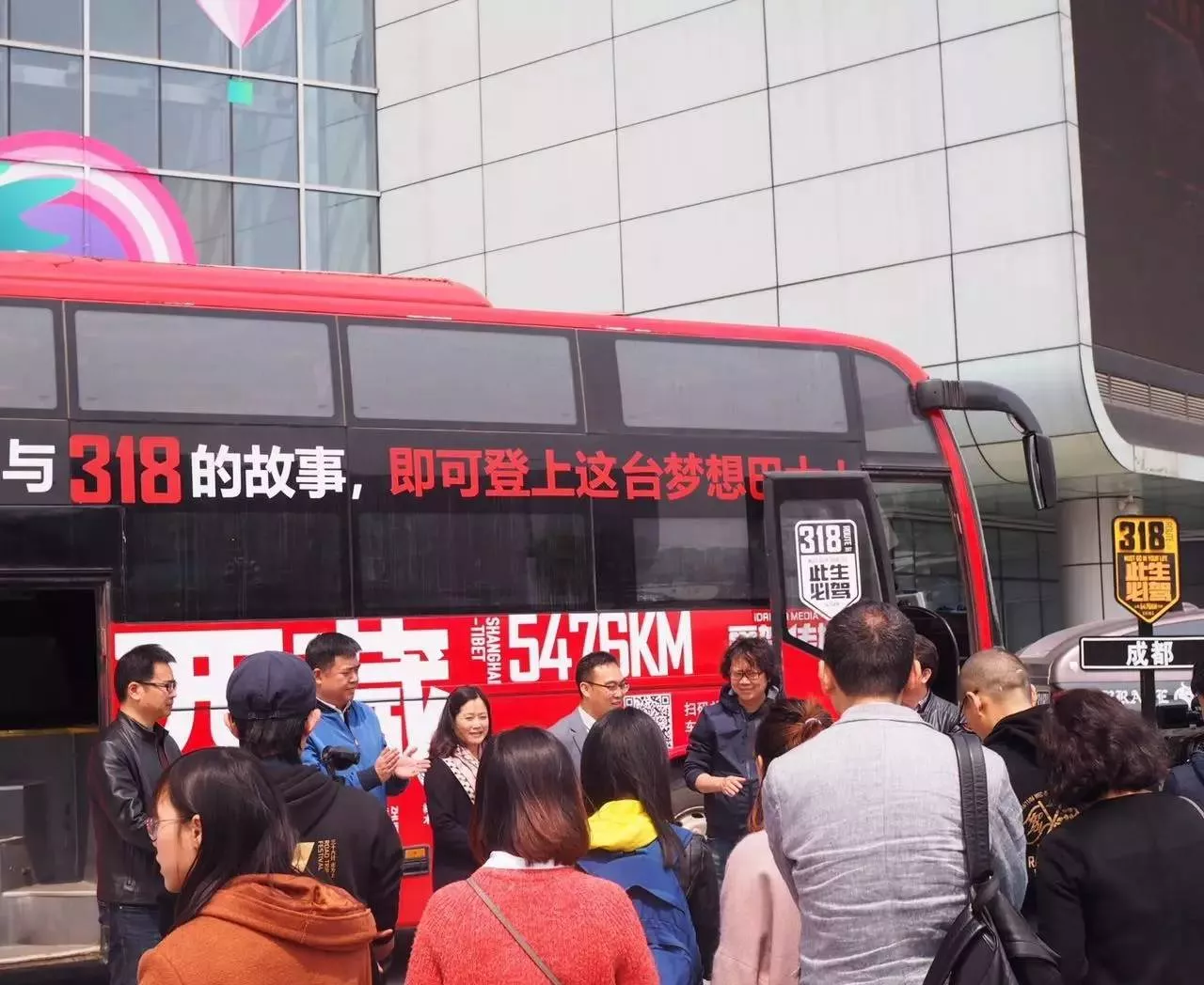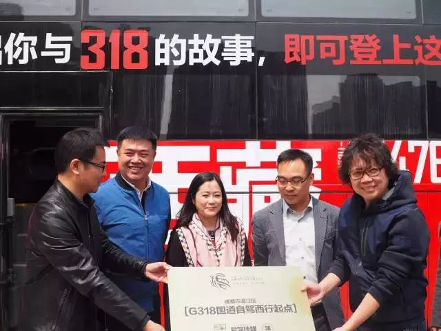 溫江區(qū)政府副區(qū)長景仁志(左一)、區(qū)旅游局局長高曉春(右一)、成都西行起點(diǎn)旅游資源開發(fā)有限公司董事長左良驥(右二)、愛駕傳媒CEO李克崎(左二)登上318夢想大巴開展探討“西行起點(diǎn)”品牌打造一年來的成果及未來規(guī)劃