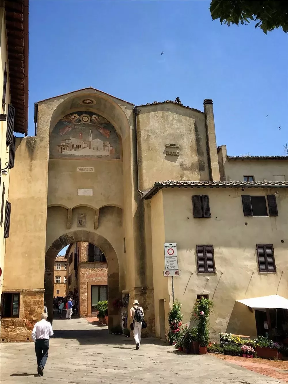 皮恩扎出現(xiàn)得正是時候。游人總是健忘的,將近兩小時的全景鄉(xiāng)野公路片,足以讓人放下錫耶納英雄遲暮的那份悲情,轉(zhuǎn)而期待起恬淡的田園生活。下車時日頭仍烈,照在不遠處的暖黃色城門上。