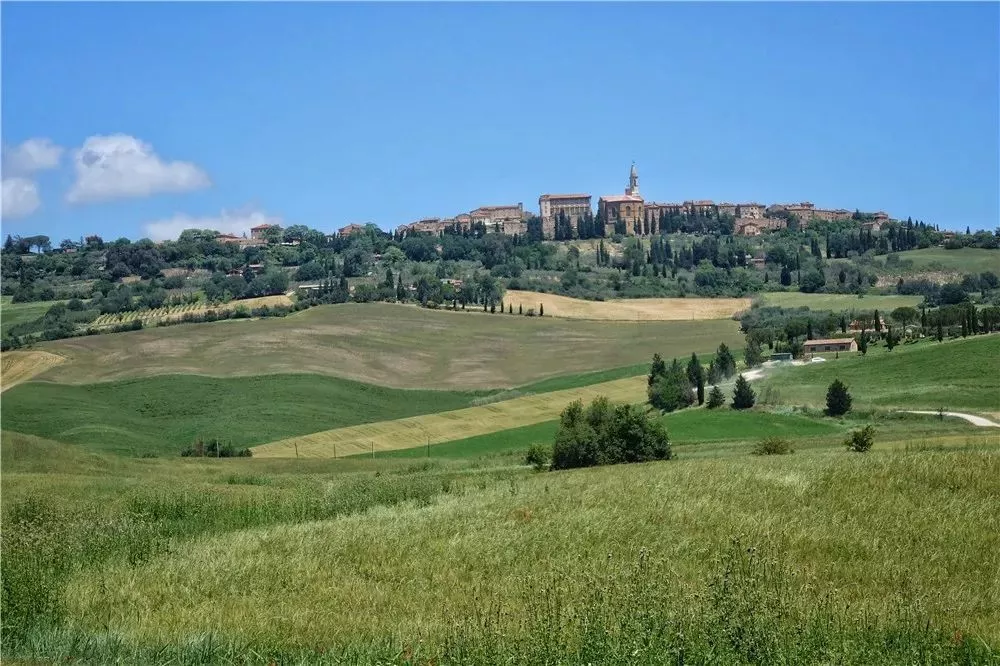 相比過于工整的阿爾卑斯山一帶,托斯卡納有種不被規(guī)訓的樸拙。乘客們打著盹兒,倒也不會錯過什么——什么時候醒來,什么時候還是這場流動的盛宴。莊園、城鎮(zhèn)一個個被我們甩在身后,麥浪聲一路隨行,向著皮恩扎(Pienza)駛?cè)ァ?/p>