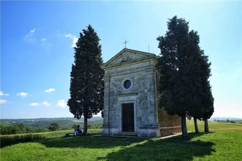 過了一會兒,面前出現(xiàn)一扇鐵絲網(wǎng)門,不知被誰挖了個洞,剛好容得下一個人進出。往遠一看,原來這是通向“小耳朵教堂”(Cappella della Madonna di Vitaleta)的一條捷徑。大喜,推著車子鉆進去,再沿土路騎一小段,就到了教堂跟前。這教堂的俏皮昵稱,來自于它兩旁的柏樹。