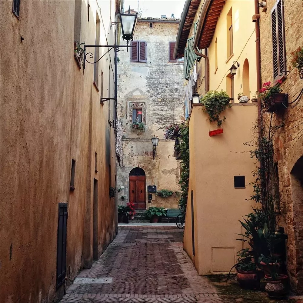 和端莊持重的錫耶納不同,皮恩扎是明快清麗的。明黃色的小閣樓,拱形門洞上各式凹凸紋路的紅褐色木門,長方形對窗微掩,漆成深綠色或保持原木色,宅院無論新舊,門前都有精心養(yǎng)護的盆栽,石墻上還有蔓生綠植,目不暇接。