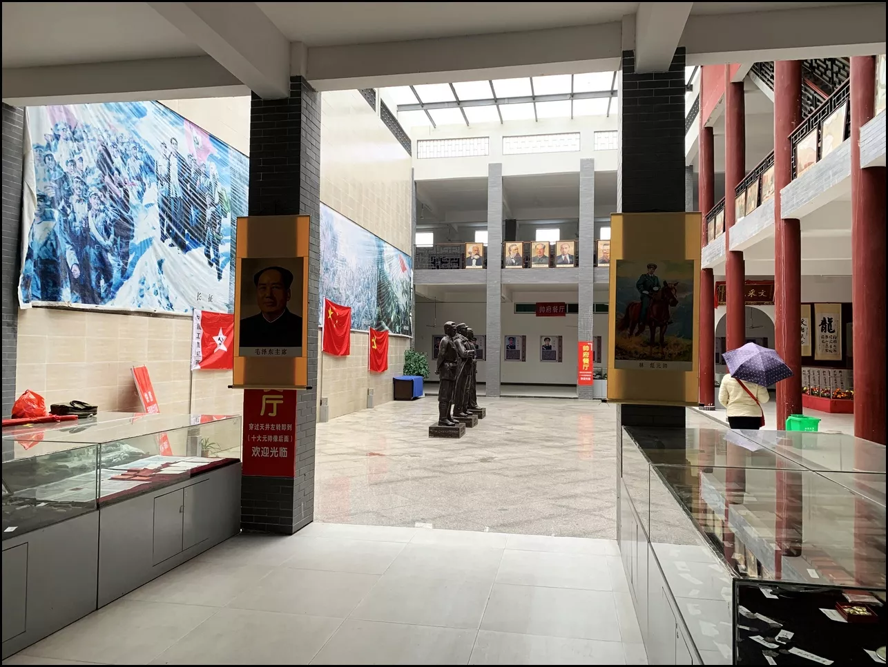 展館中央有三尊立姿雕像,分別為林育英、林育南、林彪(林育蓉),均為中國革命作出了卓越貢獻。其中,林育英、林育南為革命烈士。后面一字排開掛著中國工農(nóng)紅軍軍旗、“八一”軍旗、國旗和黨旗。背景墻上是“過雪山草地”、“飛奪瀘定橋”、“平型關大捷”等大型裝飾畫。