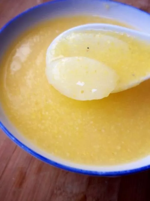 五、六口之家一頓,用二斤玉米放在煨罐中,放進(jìn)漫過玉米頭的水,放進(jìn)鍋內(nèi),利用煮飯后的余火圍起來,約三、四小時(shí)即浸透,玉米因受熱吸足水份呈飽滿狀態(tài),然后用水磨磨成糊漿。磨時(shí)用勺子每次舀10粒玉米左右,間隔不停地從磨眼中倒進(jìn)去,隨磨盤的轉(zhuǎn)動(dòng),糊漿落入磨桶中,磨完后,用少量的清水刷磨盤及桶,將所有糊漿收集到盆中待用。鐵鍋中放入約大半鍋水,用柴火燒沸后,將盆中的糊漿下進(jìn)三分之二,用勺攪動(dòng),使糊漿溶進(jìn)整個(gè)沸水中,并防止滯底。燒沸后,視其稀厚情況,再將另外的三分之一糊漿用勺溝進(jìn)去,不停地?cái)噭?dòng),如厚就放適量開水進(jìn)去,如稀,就再溝點(diǎn)糊漿進(jìn)去,攪動(dòng)燒開。將事先洗好的山芋四斤左右,改刀成段摻進(jìn)粥中,再攪動(dòng)燒沸,用勺子柄牙好鍋蓋,片刻后,拿去勺子蓋好鍋蓋,保持鍋膛內(nèi)的余火,燜二小時(shí)即熟。盛熟上桌時(shí),每碗夾山芋段二、三塊。用蘿卜干或咸菜,或豆醬搭著吃。此粥用于早、晚餐。特點(diǎn):柔膩潤滑,甜美適口,食后暢胃氣,生津液。( 淮陰)