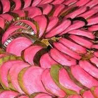 把蒸好的糯米飯拌上香菇、蝦米、瘦肉、臘腸等,一齊炒成濃香的糯米飯作餡料。捏薄的紅粿外皮,舀些糯米飯,包好捏緊,再放進紅粿模印里壓平夾緊,打開紅粿模印,一個餅狀的紅粿就做成了。包豆沙餡的做法一樣,只是豆沙有兩種:一種是用紅豆沙。將紅豆在水里浸泡到可以剝去外皮后,放石臼里杵成豆泥,或者直接把紅豆磨成粉,加上糖做成豆沙;還有一種是花生餡。把花生炒熟去外皮后,放石臼里杵成碎末,加上白糖就是餡料。