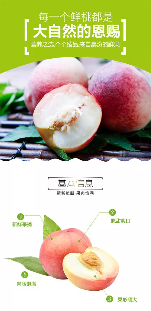 熟后的蟠桃,白中透紅,扎一個(gè)小孔,可用嘴把桃汁全部吸光。此桃有“五月鮮”、“薄皮”、“秋