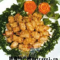 油泡魚冊 用料: 魚肉300克,火腿100克,濕冬菇75克,筍125克,芹菜50克,雞蛋2個,味精5克,精鹽5克,胡椒粉1克,濕淀粉35克,上湯50克,生油1000克(耗100克),蒜米50克。 制法: (1)將魚肉刮下剁成魚肉茸,去凈筋盛在盆內,放入味精、精鹽拌和,使勁地攪勻至有粘性待用。將火腿、冬菇、筍、芹菜均切成條。然后將打好的魚肉取一小團放在鉆板上,用刀拍壓成小薄片,上面放上火腿、冬菇、筍、芹菜條鄭起來,制畢后用刀切平兩頭,便成魚冊生胚。把蛋白放進碗內,加入濕淀粉,拌和成蛋白漿待用。 (2)用一只小碗,加入味精、精鹽、胡椒粉、料酒、濕淀粉和少許上湯拌和,調成芡湯待用。 (3)燒熱炒鼎倒入生油,待油燒至七成熟時,將魚冊拖上蛋粉漿投入油鼎拉一下油倒出,瀝去油分。炒鼎下豬油,把蒜米炒成金黃色,倒入魚冊,烹入料酒,和小碗內的調料,顛翻幾下,取出裝盤即成。 特點: 鮮嫩,脆香。