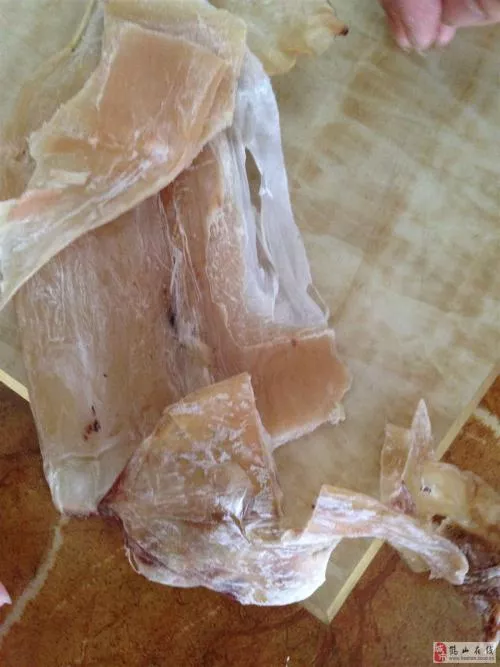 魷魚冠以"假"字,因為主料不是魷魚而用鮮豬舌。制作時先將豬舌浸入沸水,至表面發(fā)白,剝?nèi)ネ饽は磧袅栏?,從舌根和硬腭處向舌尖分直、孤線劃5刀,硬腭處全剖成魷魚須6條;舌體半剖為魷魚體,舌根成魷魚眼。然后將加工品放入盒內(nèi),佐以精鹽、白糖、元油、曲酒、硝和多味大料,腌制兩天,掛于陰涼通風(fēng)處,10天左右即成。食用時清洗表面灰垢,蒸煮1小時左右,切成片狀,裝盤時仍復(fù)原形。其外觀色澤醬紅,酷似魷魚,生動別致,肉質(zhì)細密。食之咸甜適口,回味綿長。