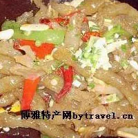 羊筋是羊蹄的韌帶。青海的羊筋在宰殺季節(jié),經(jīng)過剔取、拉直、陰干,扎成小把,可長期保存,久藏不壞。用羊筋做的菜肴品種很多,是青?;?、漢族筵席中最常見也是很有聲譽的地方菜之一。由于羊筋是膠質(zhì)組成,比起海參、魚翅來,價廉味美,是烹制高筵美饌的重要佳料。清代的全羊席中有一道"蜜汁髓筋"就是以羊筋作全料的。先用菜油或羊滑油燒十分熱,將油鍋旁移,待溫度降低些,放入干羊筋,慢慢再加溫油鍋炸透。將炸好的羊筋,泡發(fā)一二十小時,剔去筋膜,揀去雜毛,再放開水中燉煮,加鹼除油漬,浸泡松軟,略加醋除去鹼味,清水漂洗,用羊湯(雞湯更佳)燒燉,以姜粉、胡椒、精鹽、干辣椒、蔥段等為佐料,即為燒羊筋。如將羊肉切為細末,加蒜泥拌勾,調(diào)佐料后和羊筋一并上籠蒸透,再澆湯汁,撒蔥段、香菜,即是肉末羊筋。如將洗凈的羊筋條用團粉蛋白調(diào)糊狀掛芡過油,出鍋乘熱澆冰糖蜂蜜的濃汁,就是蜜汁羊筋。西寧地區(qū)婚喜筵席上的一道名為"三燒"的菜就是以羊筋為主,肉久、肉塊陪襯的地方菜,配海參、竹筍合燴者叫"海三鮮"。以羊筋作主料可作多種萊,品名眾多,其味各有千秋。