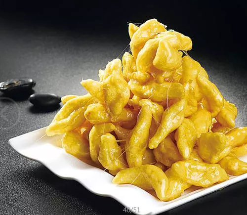 酥黃菜是哈爾濱的傳統(tǒng)菜肴,在東北地區(qū)特別流行,經(jīng)常作為宴席里的壓桌甜菜,也是哈爾濱著名的宴席名菜。酥黃菜最早的名字叫“酥白果”,雞蛋入菜,飯館中稱“白果”,早在民國時(shí)期,“白果菜肴”是哈爾濱大飯館中的常見甜菜。酥黃菜是東北的特色拔絲菜肴之一,做法非常簡單,食材也非常簡單,由雞蛋、淀粉為主要食材,配以油、糖等輔料制作而成,成菜松軟酥香,味道甜美,酥香甜脆,老少皆宜。酥黃菜更是被評為“哈埠十大經(jīng)典名菜”?!驹敿?xì)】