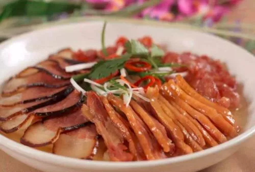 湖南地方傳統(tǒng)名菜,屬湘菜系。是以臘豬肉、臘雞、臘魚、雞湯和調(diào)料,下鍋清蒸而成。做法簡單,其臘香濃重、咸甜適口、柔韌不膩,有開胃祛寒、消食等功效。相傳,臘味合蒸是偶然拼湊成的一道美味。很久以前開飯館的劉七,破產(chǎn)后流落它鄉(xiāng)。到一座縣城乞討來一些年貨,如臘魚、臘肉什么的。劉七把討來的臘魚臘肉調(diào)配一下用蒸缽盛了,在一個財(cái)主家的屋檐下,生火做了起來。財(cái)主家宴請來的賓客聞到香味劉七,用了遠(yuǎn)超于這些臘味的價(jià)錢將這盤菜買了下來,并請劉七到自己飯館中做廚師,劉七欣然答應(yīng)。劉七后又對這道菜加以改進(jìn),色香味俱全,取名為臘味合蒸