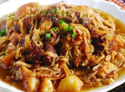 榆林大燴菜是陜西榆林地區(qū)特色菜,簡稱燴菜,其歷史可追溯至明清時(shí)期,此菜源于內(nèi)蒙古,進(jìn)入榆林后加入陜北獨(dú)特的風(fēng)味,其主要由粉條、瘦肉、土豆、蔬菜等組成,味道鮮美,回味無窮。榆林大燴菜經(jīng)過多年發(fā)展,已成為榆林的一道名菜。它選用本地的豬肉、雞肉、羊肉,配以豆腐、粉條、土豆等,做成不同口味、各有特色的大燴菜。大燴菜顏色紅褐誘人,配菜合理,豬肉噴香,土豆酥綿,粉條滑爽,是佐飯的上佳美味。由于其葷素兼?zhèn)?,營養(yǎng)豐富,經(jīng)濟(jì)實(shí)惠,是本地和外地人必吃的特色菜之一?!驹敿?xì)】
