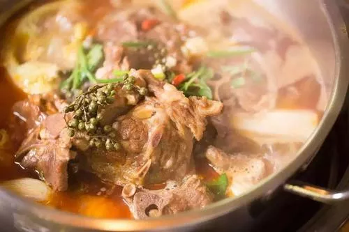 老昆明羊湯鍋即全羊湯鍋,是昆明的一種火鍋特色菜肴,也是云南人民傳統(tǒng)的風味特色菜,屬于滇菜系。昆明羊湯鍋是把山羊宰殺洗凈,切成大小不等的坨狀,放入一口大鐵鍋或行軍鍋內(nèi),和羊肝、羊心、羊腸、羊肚等雜碎一鍋煮,然后蘸些又麻又辣又香的蘸水,此菜飄香四溢,肉味醇厚,鮮徹透骨,脫骨不離骨。昆明的羊湯鍋品種比較齊全,融合了各地的特色,融合了傳統(tǒng)的會澤黑山羊火鍋吃法,東川的肥厚的帶皮羊肉、祿勸的雪山羊肉、楚雄的全羊湯鍋等。老昆明羊湯鍋被中國烹飪協(xié)會評選為“中國菜”之云南十大經(jīng)典名菜,還被云南省餐飲與美食行業(yè)協(xié)會評選為“昆