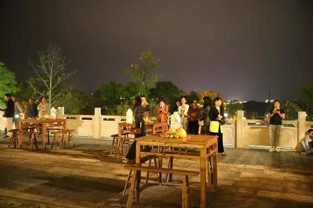 塔前,人們抬來上八仙桌,擺上“貢品”,等待嫦娥歸來;電視臺正準(zhǔn)備錄制節(jié)目。