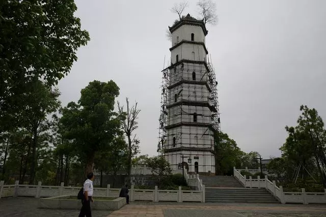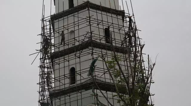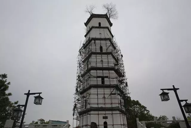 文成塔坐落于江西省玉山縣城西回龍山上,明萬歷二十一年(1593年)始建,為祈縣邑民居殷富,文運(yùn)亨通,故名為“文成塔”。清朝康熙年間倒塌,乾隆三十七年(1772年)動工重建,乾隆三十九年冬(1774年)竣工;至今有400多年悠久的歷史。遠(yuǎn)遠(yuǎn)望去,高高的塔上,多了幾名“蜘蛛俠”,他們是架子工,正在拆除維修鋼架。10月4日,正是中秋佳節(jié),萬家團(tuán)圓時,問其中一名工人怎么沒放假時,他說:”今晚有